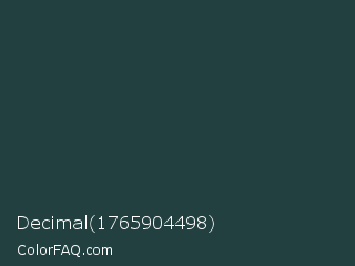 Decimal 1765904498 Color is a very dark cyan color and the nearest color is Te Papa Green #1e433c. Hex code #234040 and RGB value is rgb(35,64,64). In RGB color space, this color is composed of 14% red, 25% green, 25% blue, In CMYK color space, this color is composed of 45% cyan, 0% magenta, 0% yellow , 75% black , In HSL color space, this color has a hue angle of 180° , 29% saturation and 19% lightness.