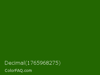 Decimal 1765968275 Color is a very dark green color and the nearest color is Lincoln Green #195905. Hex code #236701 and RGB value is rgb(35,103,1). In RGB color space, this color is composed of 14% red, 40% green, 0% blue, In CMYK color space, this color is composed of 66% cyan, 0% magenta, 99% yellow , 60% black , In HSL color space, this color has a hue angle of 100° , 98% saturation and 20% lightness.