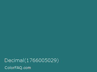 Decimal 1766005029 Color is a dark cyan color and the nearest color is Elm #1c7c7d. Hex code #237275 and RGB value is rgb(35,114,117). In RGB color space, this color is composed of 14% red, 45% green, 46% blue, In CMYK color space, this color is composed of 70% cyan, 3% magenta, 0% yellow , 54% black , In HSL color space, this color has a hue angle of 182° , 54% saturation and 30% lightness.