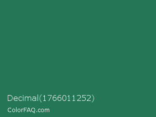 Decimal 1766011252 Color is a dark green color and the nearest color is Eucalyptus #278a5b. Hex code #237756 and RGB value is rgb(35,119,86). In RGB color space, this color is composed of 14% red, 47% green, 34% blue, In CMYK color space, this color is composed of 71% cyan, 0% magenta, 28% yellow , 53% black , In HSL color space, this color has a hue angle of 156° , 55% saturation and 30% lightness.