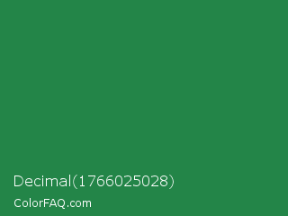 Decimal 1766025028 Color is a normal green color and the nearest color is Sea Green #2e8b57. Hex code #238548 and RGB value is rgb(35,133,72). In RGB color space, this color is composed of 14% red, 52% green, 28% blue, In CMYK color space, this color is composed of 74% cyan, 0% magenta, 46% yellow , 48% black , In HSL color space, this color has a hue angle of 143° , 58% saturation and 33% lightness.