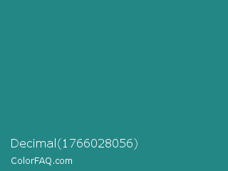 Decimal 1766028056 Color is a normal cyan color and the nearest color is Lochinvar #2c8c84. Hex code #238786 and RGB value is rgb(35,135,134). In RGB color space, this color is composed of 14% red, 53% green, 53% blue, In CMYK color space, this color is composed of 74% cyan, 0% magenta, 1% yellow , 47% black , In HSL color space, this color has a hue angle of 179° , 59% saturation and 33% lightness.