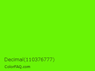 Decimal 110376777 Color is a normal green color and the nearest color is Bright Green #66ff00. Hex code #69f405 and RGB value is rgb(105,244,5). In RGB color space, this color is composed of 41% red, 96% green, 2% blue, In CMYK color space, this color is composed of 57% cyan, 0% magenta, 98% yellow , 4% black , In HSL color space, this color has a hue angle of 95° , 96% saturation and 49% lightness.