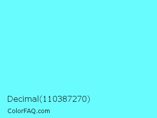 Decimal 110387270 Color is a light cyan color and the nearest color is Electric Blue #7df9ff. Hex code #69fcfe and RGB value is rgb(105,252,254). In RGB color space, this color is composed of 41% red, 99% green, 100% blue, In CMYK color space, this color is composed of 59% cyan, 1% magenta, 0% yellow , 0% black , In HSL color space, this color has a hue angle of 181° , 99% saturation and 70% lightness.