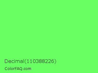 Decimal 110388226 Color is a light green color and the nearest color is Screamin Green #66ff66. Hex code #69fe62 and RGB value is rgb(105,254,98). In RGB color space, this color is composed of 41% red, 100% green, 38% blue, In CMYK color space, this color is composed of 59% cyan, 0% magenta, 61% yellow , 0% black , In HSL color space, this color has a hue angle of 117° , 99% saturation and 69% lightness.