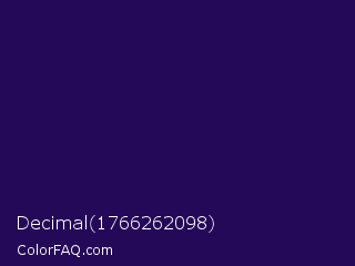 Decimal 1766262098 Color is a very dark violet color and the nearest color is Violent Violet #290c5e. Hex code #240958 and RGB value is rgb(36,9,88). In RGB color space, this color is composed of 14% red, 4% green, 35% blue, In CMYK color space, this color is composed of 59% cyan, 90% magenta, 0% yellow , 65% black , In HSL color space, this color has a hue angle of 261° , 81% saturation and 19% lightness.