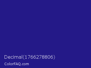 Decimal 1766278806 Color is a normal indigo color and the nearest color is Jacksons Purple #20208d. Hex code #241988 and RGB value is rgb(36,25,136). In RGB color space, this color is composed of 14% red, 10% green, 53% blue, In CMYK color space, this color is composed of 74% cyan, 82% magenta, 0% yellow , 47% black , In HSL color space, this color has a hue angle of 246° , 69% saturation and 32% lightness.