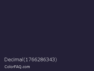 Decimal 1766286343 Color is a very dark indigo color and the nearest color is Steel Gray #262335. Hex code #242037 and RGB value is rgb(36,32,55). In RGB color space, this color is composed of 14% red, 13% green, 22% blue, In CMYK color space, this color is composed of 35% cyan, 42% magenta, 0% yellow , 78% black , In HSL color space, this color has a hue angle of 250° , 26% saturation and 17% lightness.