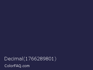 Decimal 1766289801 Color is a very dark indigo color and the nearest color is Yankees Blue #1c2841. Hex code #242345 and RGB value is rgb(36,35,69). In RGB color space, this color is composed of 14% red, 14% green, 27% blue, In CMYK color space, this color is composed of 48% cyan, 49% magenta, 0% yellow , 73% black , In HSL color space, this color has a hue angle of 242° , 33% saturation and 20% lightness.