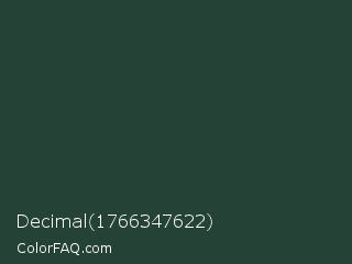 Decimal 1766347622 Color is a very dark green color and the nearest color is Te Papa Green #1e433c. Hex code #244336 and RGB value is rgb(36,67,54). In RGB color space, this color is composed of 14% red, 26% green, 21% blue, In CMYK color space, this color is composed of 46% cyan, 0% magenta, 19% yellow , 74% black , In HSL color space, this color has a hue angle of 155° , 30% saturation and 20% lightness.