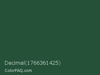 Decimal 1766361425 Color is a dark green color and the nearest color is Brunswick Green #1b4d3e. Hex code #245137 and RGB value is rgb(36,81,55). In RGB color space, this color is composed of 14% red, 32% green, 22% blue, In CMYK color space, this color is composed of 56% cyan, 0% magenta, 32% yellow , 68% black , In HSL color space, this color has a hue angle of 145° , 38% saturation and 23% lightness.