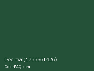Decimal 1766361426 Color is a dark green color and the nearest color is Brunswick Green #1b4d3e. Hex code #245138 and RGB value is rgb(36,81,56). In RGB color space, this color is composed of 14% red, 32% green, 22% blue, In CMYK color space, this color is composed of 56% cyan, 0% magenta, 31% yellow , 68% black , In HSL color space, this color has a hue angle of 147° , 38% saturation and 23% lightness.