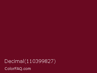Decimal 110399827 Color is a dark red color and the nearest color is Black Rose #67032d. Hex code #6a0921 and RGB value is rgb(106,9,33). In RGB color space, this color is composed of 42% red, 4% green, 13% blue, In CMYK color space, this color is composed of 0% cyan, 92% magenta, 69% yellow , 58% black , In HSL color space, this color has a hue angle of 345° , 84% saturation and 23% lightness.