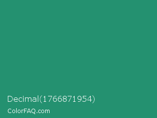 Decimal 1766871954 Color is a normal green color and the nearest color is Illuminating Emerald #319177. Hex code #249170 and RGB value is rgb(36,145,112). In RGB color space, this color is composed of 14% red, 57% green, 44% blue, In CMYK color space, this color is composed of 75% cyan, 0% magenta, 23% yellow , 43% black , In HSL color space, this color has a hue angle of 162° , 60% saturation and 35% lightness.