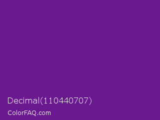 Decimal 110440707 Color is a normal purple color and the nearest color is Seance #731e8f. Hex code #6a188f and RGB value is rgb(106,24,143). In RGB color space, this color is composed of 42% red, 9% green, 56% blue, In CMYK color space, this color is composed of 26% cyan, 83% magenta, 0% yellow , 44% black , In HSL color space, this color has a hue angle of 281° , 71% saturation and 33% lightness.