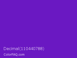 Decimal 110440788 Color is a normal violet color and the nearest color is Purple Heart Crayola #652dc1. Hex code #6a18c2 and RGB value is rgb(106,24,194). In RGB color space, this color is composed of 42% red, 9% green, 76% blue, In CMYK color space, this color is composed of 45% cyan, 88% magenta, 0% yellow , 24% black , In HSL color space, this color has a hue angle of 269° , 78% saturation and 43% lightness.