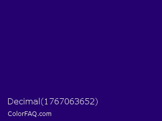 Decimal 1767063652 Color is a very dark indigo color and the nearest color is Paris M #26056a. Hex code #250170 and RGB value is rgb(37,1,112). In RGB color space, this color is composed of 15% red, 0% green, 44% blue, In CMYK color space, this color is composed of 67% cyan, 99% magenta, 0% yellow , 56% black , In HSL color space, this color has a hue angle of 259° , 98% saturation and 22% lightness.