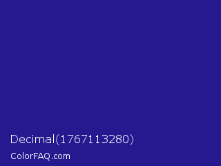 Decimal 1767113280 Color is a normal indigo color and the nearest color is Jacksons Purple #20208d. Hex code #251990 and RGB value is rgb(37,25,144). In RGB color space, this color is composed of 15% red, 10% green, 56% blue, In CMYK color space, this color is composed of 74% cyan, 83% magenta, 0% yellow , 44% black , In HSL color space, this color has a hue angle of 246° , 70% saturation and 33% lightness.