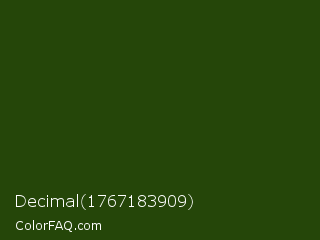 Decimal 1767183909 Color is a very dark green color and the nearest color is Green House #24500f. Hex code #254609 and RGB value is rgb(37,70,9). In RGB color space, this color is composed of 15% red, 27% green, 4% blue, In CMYK color space, this color is composed of 47% cyan, 0% magenta, 87% yellow , 73% black , In HSL color space, this color has a hue angle of 92° , 77% saturation and 15% lightness.
