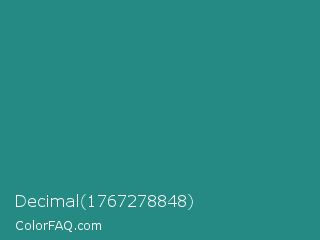 Decimal 1767278848 Color is a normal cyan color and the nearest color is Lochinvar #2c8c84. Hex code #258984 and RGB value is rgb(37,137,132). In RGB color space, this color is composed of 15% red, 54% green, 52% blue, In CMYK color space, this color is composed of 73% cyan, 0% magenta, 4% yellow , 46% black , In HSL color space, this color has a hue angle of 177° , 57% saturation and 34% lightness.