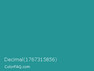 Decimal 1767315856 Color is a normal cyan color and the nearest color is Lochinvar #2c8c84. Hex code #259596 and RGB value is rgb(37,149,150). In RGB color space, this color is composed of 15% red, 58% green, 59% blue, In CMYK color space, this color is composed of 75% cyan, 1% magenta, 0% yellow , 41% black , In HSL color space, this color has a hue angle of 181° , 60% saturation and 37% lightness.