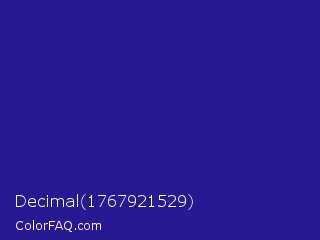 Decimal 1767921529 Color is a normal indigo color and the nearest color is Jacksons Purple #20208d. Hex code #261993 and RGB value is rgb(38,25,147). In RGB color space, this color is composed of 15% red, 10% green, 58% blue, In CMYK color space, this color is composed of 74% cyan, 83% magenta, 0% yellow , 42% black , In HSL color space, this color has a hue angle of 246° , 71% saturation and 34% lightness.