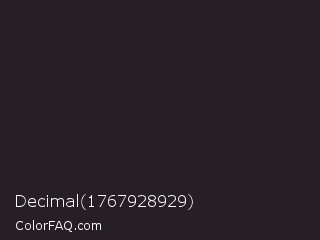 Decimal 1767928929 Color is a very dark magenta color and the nearest color is Raisin Black #242124. Hex code #262025 and RGB value is rgb(38,32,37). In RGB color space, this color is composed of 15% red, 13% green, 15% blue, In CMYK color space, this color is composed of 0% cyan, 16% magenta, 3% yellow , 85% black , In HSL color space, this color has a hue angle of 310° , 9% saturation and 14% lightness.