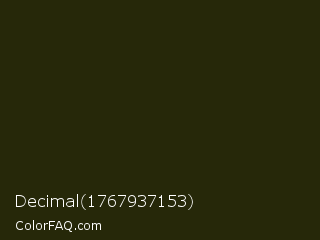 Decimal 1767937153 Color is a very dark yellow color and the nearest color is Mikado #2d2510. Hex code #262809 and RGB value is rgb(38,40,9). In RGB color space, this color is composed of 15% red, 16% green, 4% blue, In CMYK color space, this color is composed of 5% cyan, 0% magenta, 78% yellow , 84% black , In HSL color space, this color has a hue angle of 64° , 63% saturation and 10% lightness.