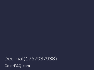 Decimal 1767937938 Color is a very dark blue color and the nearest color is Ebony Clay #26283b. Hex code #262940 and RGB value is rgb(38,41,64). In RGB color space, this color is composed of 15% red, 16% green, 25% blue, In CMYK color space, this color is composed of 41% cyan, 36% magenta, 0% yellow , 75% black , In HSL color space, this color has a hue angle of 233° , 25% saturation and 20% lightness.