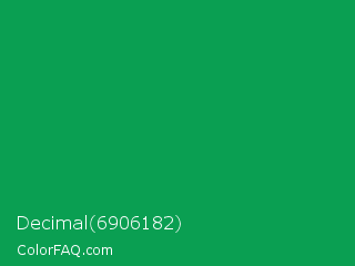 Decimal 6906182 Color is a normal green color and the nearest color is Green Pigment #00a550. Hex code #0a9f52 and RGB value is rgb(10,159,82). In RGB color space, this color is composed of 4% red, 62% green, 32% blue, In CMYK color space, this color is composed of 94% cyan, 0% magenta, 48% yellow , 38% black , In HSL color space, this color has a hue angle of 149° , 88% saturation and 33% lightness.