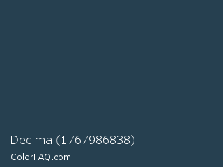 Decimal 1767986838 Color is a dark blue color and the nearest color is Japanese Indigo #264348. Hex code #264050 and RGB value is rgb(38,64,80). In RGB color space, this color is composed of 15% red, 25% green, 31% blue, In CMYK color space, this color is composed of 53% cyan, 20% magenta, 0% yellow , 69% black , In HSL color space, this color has a hue angle of 203° , 36% saturation and 23% lightness.