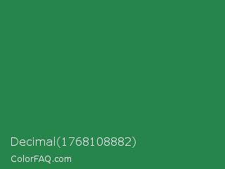 Decimal 1768108882 Color is a normal green color and the nearest color is Sea Green #2e8b57. Hex code #268548 and RGB value is rgb(38,133,72). In RGB color space, this color is composed of 15% red, 52% green, 28% blue, In CMYK color space, this color is composed of 71% cyan, 0% magenta, 46% yellow , 48% black , In HSL color space, this color has a hue angle of 141° , 56% saturation and 34% lightness.