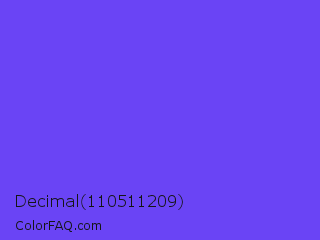 Decimal 110511209 Color is a light indigo color and the nearest color is Majorelle Blue #6050dc. Hex code #6a44f5 and RGB value is rgb(106,68,245). In RGB color space, this color is composed of 42% red, 27% green, 96% blue, In CMYK color space, this color is composed of 57% cyan, 72% magenta, 0% yellow , 4% black , In HSL color space, this color has a hue angle of 253° , 90% saturation and 61% lightness.