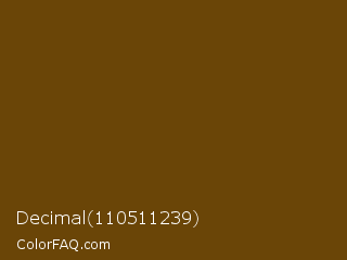 Decimal 110511239 Color is a very dark orange color and the nearest color is Cafe Royale #6f440c. Hex code #6a4507 and RGB value is rgb(106,69,7). In RGB color space, this color is composed of 42% red, 27% green, 3% blue, In CMYK color space, this color is composed of 0% cyan, 35% magenta, 93% yellow , 58% black , In HSL color space, this color has a hue angle of 38° , 88% saturation and 22% lightness.