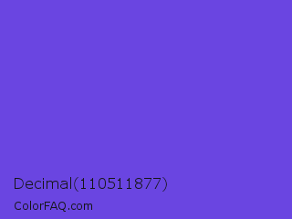 Decimal 110511877 Color is a normal indigo color and the nearest color is Majorelle Blue #6050dc. Hex code #6a45e1 and RGB value is rgb(106,69,225). In RGB color space, this color is composed of 42% red, 27% green, 88% blue, In CMYK color space, this color is composed of 53% cyan, 69% magenta, 0% yellow , 12% black , In HSL color space, this color has a hue angle of 254° , 72% saturation and 58% lightness.