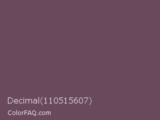 Decimal 110515607 Color is a normal magenta color and the nearest color is Zambezi #685558. Hex code #6a495d and RGB value is rgb(106,73,93). In RGB color space, this color is composed of 42% red, 29% green, 36% blue, In CMYK color space, this color is composed of 0% cyan, 31% magenta, 12% yellow , 58% black , In HSL color space, this color has a hue angle of 324° , 18% saturation and 35% lightness.