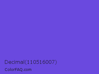 Decimal 110516007 Color is a normal indigo color and the nearest color is Majorelle Blue #6050dc. Hex code #6a49df and RGB value is rgb(106,73,223). In RGB color space, this color is composed of 42% red, 29% green, 87% blue, In CMYK color space, this color is composed of 52% cyan, 67% magenta, 0% yellow , 13% black , In HSL color space, this color has a hue angle of 253° , 70% saturation and 58% lightness.