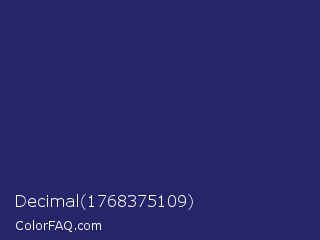 Decimal 1768375109 Color is a dark indigo color and the nearest color is Lucky Point #1a1a68. Hex code #272569 and RGB value is rgb(39,37,105). In RGB color space, this color is composed of 15% red, 15% green, 41% blue, In CMYK color space, this color is composed of 63% cyan, 65% magenta, 0% yellow , 59% black , In HSL color space, this color has a hue angle of 242° , 48% saturation and 28% lightness.