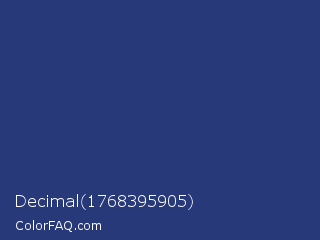 Decimal 1768395905 Color is a normal blue color and the nearest color is Astronaut #283a77. Hex code #273979 and RGB value is rgb(39,57,121). In RGB color space, this color is composed of 15% red, 22% green, 47% blue, In CMYK color space, this color is composed of 68% cyan, 53% magenta, 0% yellow , 53% black , In HSL color space, this color has a hue angle of 227° , 51% saturation and 31% lightness.