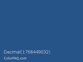 Decimal 1768449032 Color is a normal blue color and the nearest color is B Dazzled Blue #2e5894. Hex code #275488 and RGB value is rgb(39,84,136). In RGB color space, this color is composed of 15% red, 33% green, 53% blue, In CMYK color space, this color is composed of 71% cyan, 38% magenta, 0% yellow , 47% black , In HSL color space, this color has a hue angle of 212° , 55% saturation and 34% lightness.