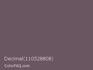 Decimal 110528808 Color is a normal rose color and the nearest color is Zambezi #685558. Hex code #6a5660 and RGB value is rgb(106,86,96). In RGB color space, this color is composed of 42% red, 34% green, 38% blue, In CMYK color space, this color is composed of 0% cyan, 19% magenta, 9% yellow , 58% black , In HSL color space, this color has a hue angle of 330° , 10% saturation and 38% lightness.
