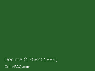 Decimal 1768461889 Color is a dark green color and the nearest color is Mughal Green #306030. Hex code #276129 and RGB value is rgb(39,97,41). In RGB color space, this color is composed of 15% red, 38% green, 16% blue, In CMYK color space, this color is composed of 60% cyan, 0% magenta, 58% yellow , 62% black , In HSL color space, this color has a hue angle of 122° , 43% saturation and 27% lightness.