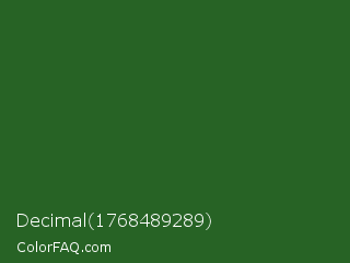 Decimal 1768489289 Color is a dark green color and the nearest color is Mughal Green #306030. Hex code #276325 and RGB value is rgb(39,99,37). In RGB color space, this color is composed of 15% red, 39% green, 15% blue, In CMYK color space, this color is composed of 61% cyan, 0% magenta, 63% yellow , 61% black , In HSL color space, this color has a hue angle of 118° , 46% saturation and 27% lightness.