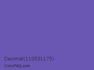 Decimal 110531175 Color is a normal indigo color and the nearest color is Blue Violet #6456b7. Hex code #6a57b3 and RGB value is rgb(106,87,179). In RGB color space, this color is composed of 42% red, 34% green, 70% blue, In CMYK color space, this color is composed of 41% cyan, 51% magenta, 0% yellow , 30% black , In HSL color space, this color has a hue angle of 252° , 38% saturation and 52% lightness.