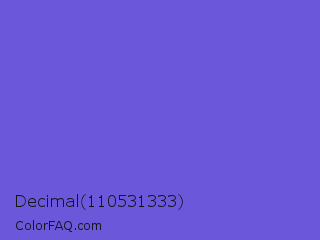 Decimal 110531333 Color is a normal indigo color and the nearest color is Slate Blue #6a5acd. Hex code #6a57d9 and RGB value is rgb(106,87,217). In RGB color space, this color is composed of 42% red, 34% green, 85% blue, In CMYK color space, this color is composed of 51% cyan, 60% magenta, 0% yellow , 15% black , In HSL color space, this color has a hue angle of 249° , 63% saturation and 60% lightness.