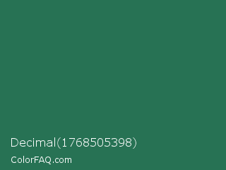 Decimal 1768505398 Color is a dark green color and the nearest color is Amazon #3b7a57. Hex code #277254 and RGB value is rgb(39,114,84). In RGB color space, this color is composed of 15% red, 45% green, 33% blue, In CMYK color space, this color is composed of 66% cyan, 0% magenta, 26% yellow , 55% black , In HSL color space, this color has a hue angle of 156° , 49% saturation and 30% lightness.