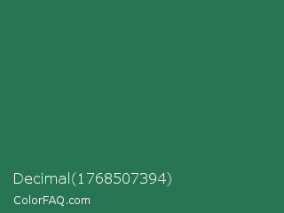 Decimal 1768507394 Color is a normal green color and the nearest color is Dark Spring Green #177245. Hex code #277552 and RGB value is rgb(39,117,82). In RGB color space, this color is composed of 15% red, 46% green, 32% blue, In CMYK color space, this color is composed of 67% cyan, 0% magenta, 30% yellow , 54% black , In HSL color space, this color has a hue angle of 153° , 50% saturation and 31% lightness.