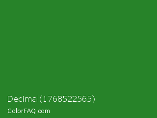Decimal 1768522565 Color is a normal green color and the nearest color is Forest Green #228b22. Hex code #278329 and RGB value is rgb(39,131,41). In RGB color space, this color is composed of 15% red, 51% green, 16% blue, In CMYK color space, this color is composed of 70% cyan, 0% magenta, 69% yellow , 49% black , In HSL color space, this color has a hue angle of 121° , 54% saturation and 33% lightness.