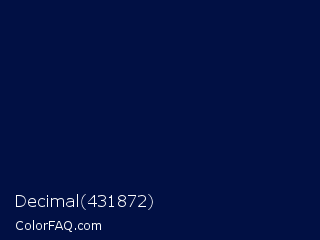 Decimal 431872 Color is a very dark blue color and the nearest color is Deep Cove #051040. Hex code #011044 and RGB value is rgb(1,16,68). In RGB color space, this color is composed of 0% red, 6% green, 27% blue, In CMYK color space, this color is composed of 99% cyan, 76% magenta, 0% yellow , 73% black , In HSL color space, this color has a hue angle of 227° , 97% saturation and 14% lightness.
