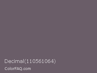 Decimal 110561064 Color is a normal magenta color and the nearest color is Salt Box #685e6e. Hex code #6a5d68 and RGB value is rgb(106,93,104). In RGB color space, this color is composed of 42% red, 36% green, 41% blue, In CMYK color space, this color is composed of 0% cyan, 12% magenta, 2% yellow , 58% black , In HSL color space, this color has a hue angle of 309° , 7% saturation and 39% lightness.